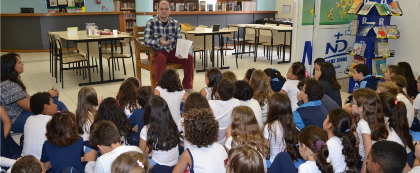 O primeiro foi protagonizado por Rodrigo Abrahin. O autor e ilustrador de livros infantis, que também é pai de estudante, apresentou, na Biblioteca Infantil do Colégio, algumas das narrativas criadas por ele mesmo, além de ter comentado sobre a carreira literária.