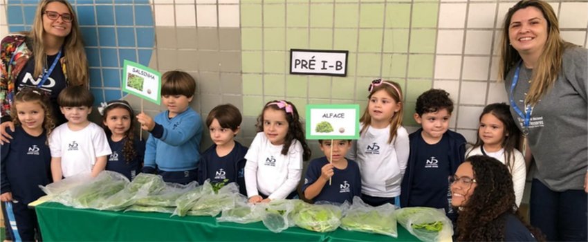 Os educandos matriculados no Pré I da Educação Infantil do Colégio Notre Dame Recreio foram envolvidos, na última semana, em uma atividade multidisciplinar que uniu as disciplinas de Geografia, Linguagens, Ciências e Matemática. Nela, a partir da colheita de uma horta plantada por eles próprios, os pequenos construíram saberes através de uma brincadeira de compra e venda.