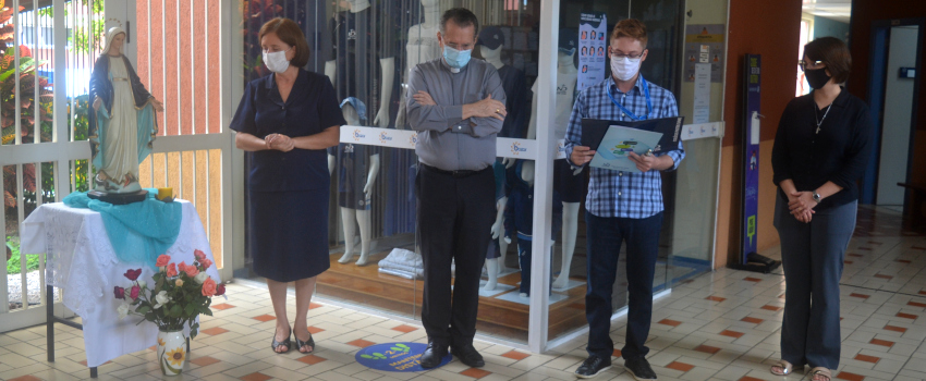 Em visita ao Colégio Notre Dame Recreio, na última sexta-feira (12), o novo responsável pela Paróquia São Pedro do Mar, Monsenhor Luiz Artur Falcão, concedeu uma bênção à comunidade educativa.