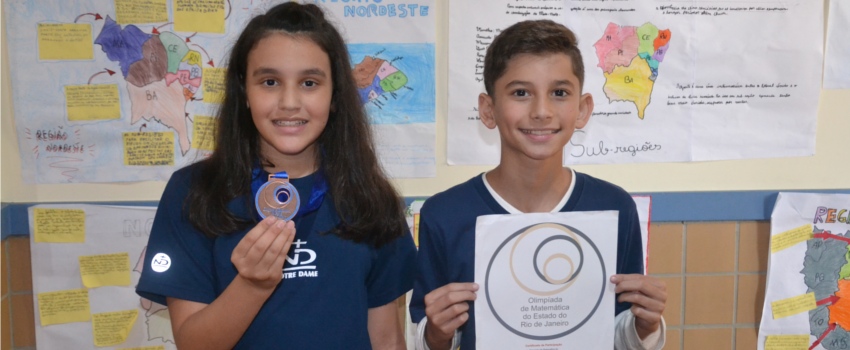 Entre os dez estudantes do 5º Ano do Ensino Fundamental do Colégio Notre Dame Recreio que se desafiaram a participar da Olimpíada de Matemática do Estado do Rio de Janeiro (OMERJ), dois deles, Luana Pessoa Aguiar e João Pedro Vila Verde Ferreira, foram homenageados pela organização da competição escolar, devido aos expressivos resultados obtidos na avaliação.