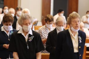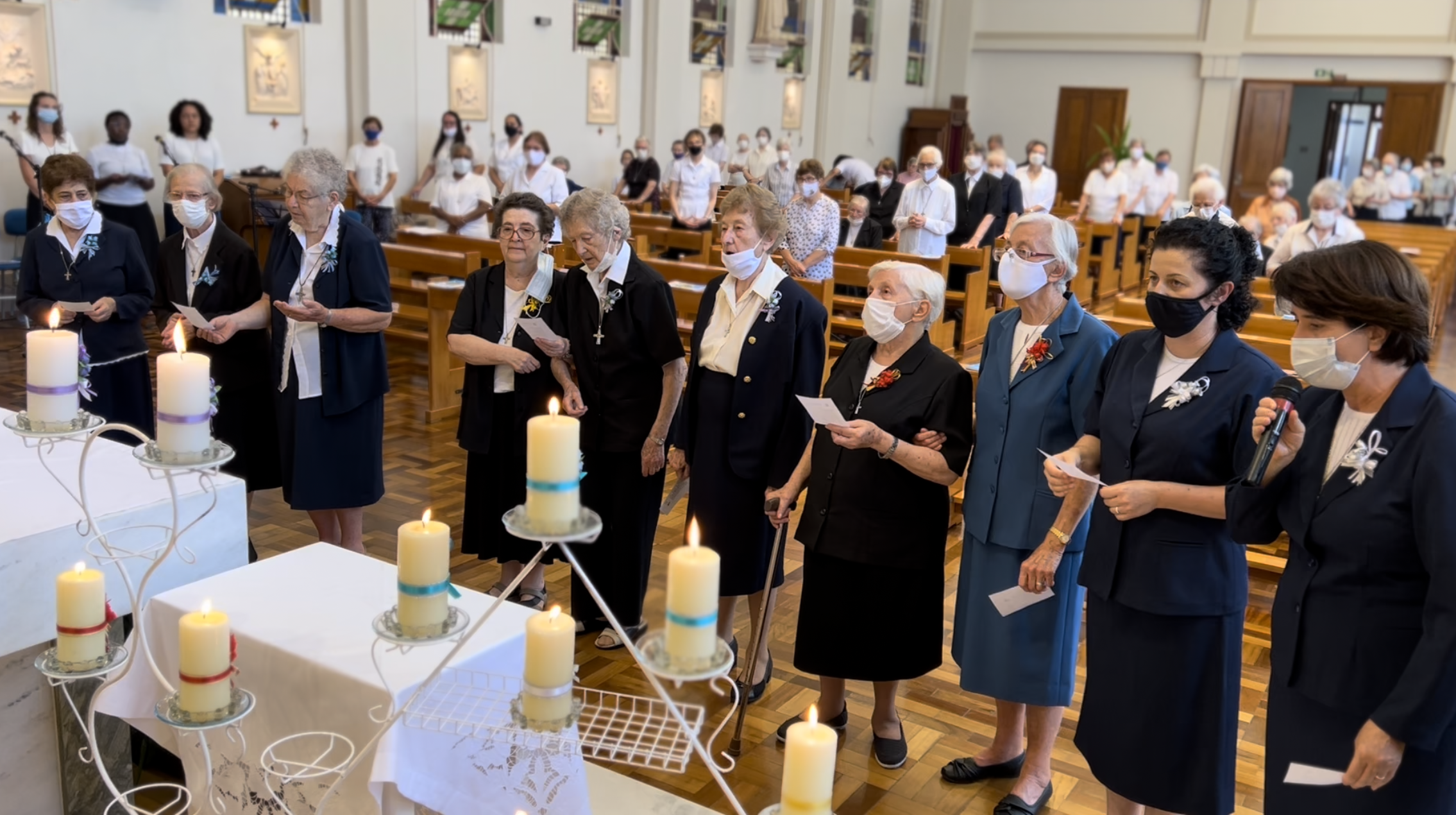 O motivo: celebrar o jubileu de vida consagrada de 13 irmãs de Notre Dame. Para elas, o ano de 2022 marca as comemorações de 25, 50, 60, 65 e 75 anos de consagração à vida religiosa. Na cerimônia jubilar, as religiosas renovam os votos de pobreza, obediência e castidade que norteiam a experiência da fé como Irmãs de Nossa Senhora, proferidos há décadas, pela primeira vez.