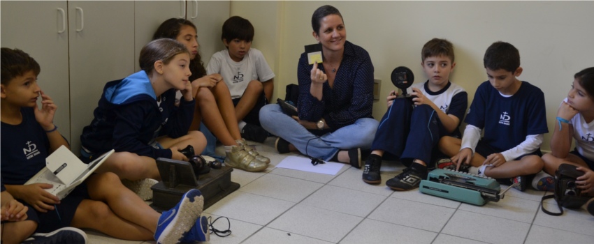 A primeira delas foi o desafio de conhecer objetos que, no passado, eram utilizados por seus pais e avós. bem-conectados2“Com a ajuda das famílias, montamos uma exposição de itens como telefone de disco, máquina de escrever, máquina fotográfica analógica, disquete, walkman, fita K7, vitrola e disco de vinil”, descreve a coordenadora Pedagógica do Ensino Fundamental I, Cristina Varga. Interagindo com eles, complementa, as crianças tentaram descobrir a função de cada um.